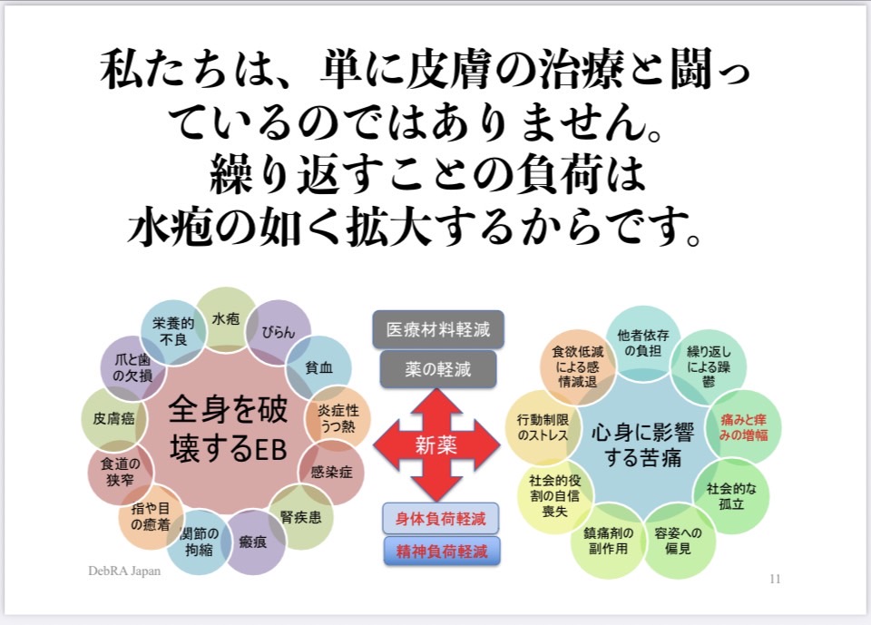 体の痛みがもたらす、命に関わる合併症や、心を病んでしまう社会生活の偏見や情報の少ない中での孤立化とも闘っています。