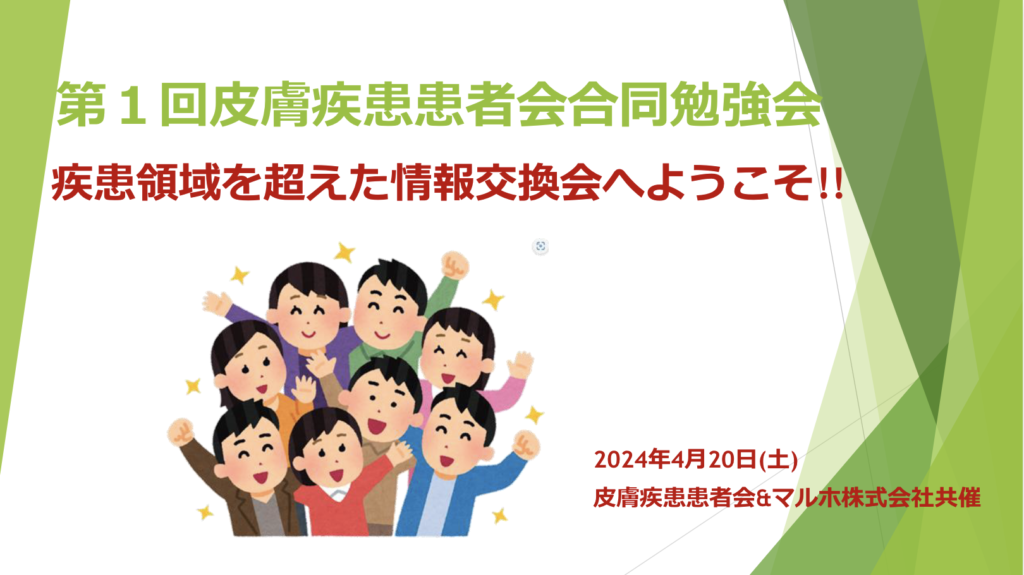 皮膚疾患患者団体の第1回合同勉強会に参加しました。マルホ株式会社さんのご協力のもと、日本乾癬患者連合会の方々が主催してくださり実現した初の勉強会です。他の患者会同士の横の繋がりというのはなかなかなく、実に有意義な勉強会になりました。