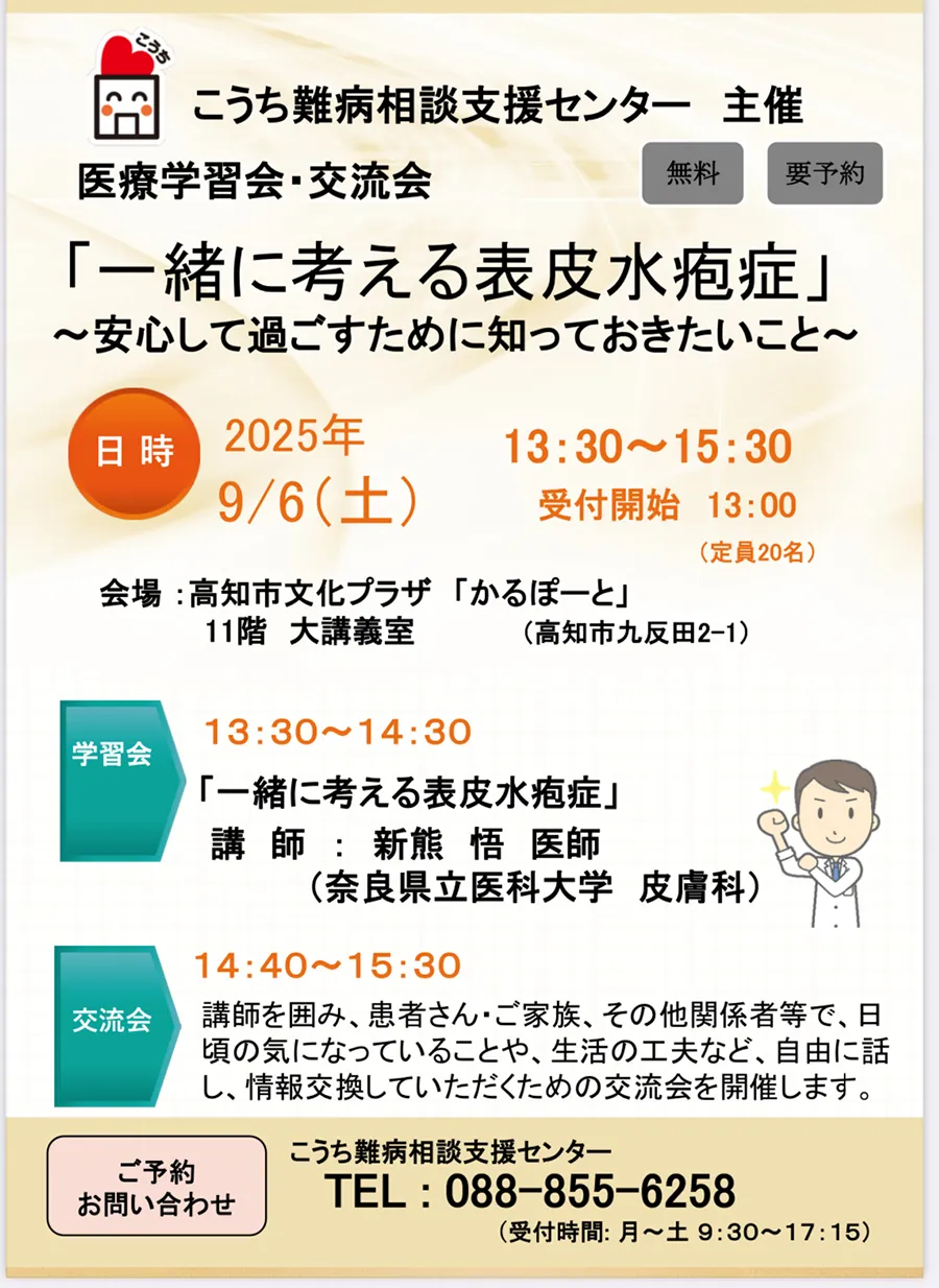 四国地域では愛媛県に次いで2回目の学習・交流会は高知県での開催となります。主催は、こうち難病相談支援センターのお声がけで、NPO法人表皮水疱症友の会DebRA Japanの医療アドバイザーの新熊悟先生をお迎えし、専門医としての最新情報と詳しいQ&A、懇親会も予定していますので、関心のある方はぜひご参加ください。