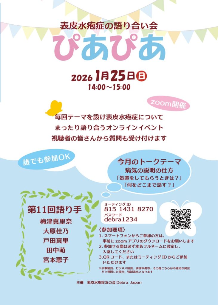 表皮水疱症の仲間たちが、それぞれの「生活あるある」について語り合うオンラインイベント「ぴあぴあ」を、2025年4月より毎月一回日曜日に開催しております。